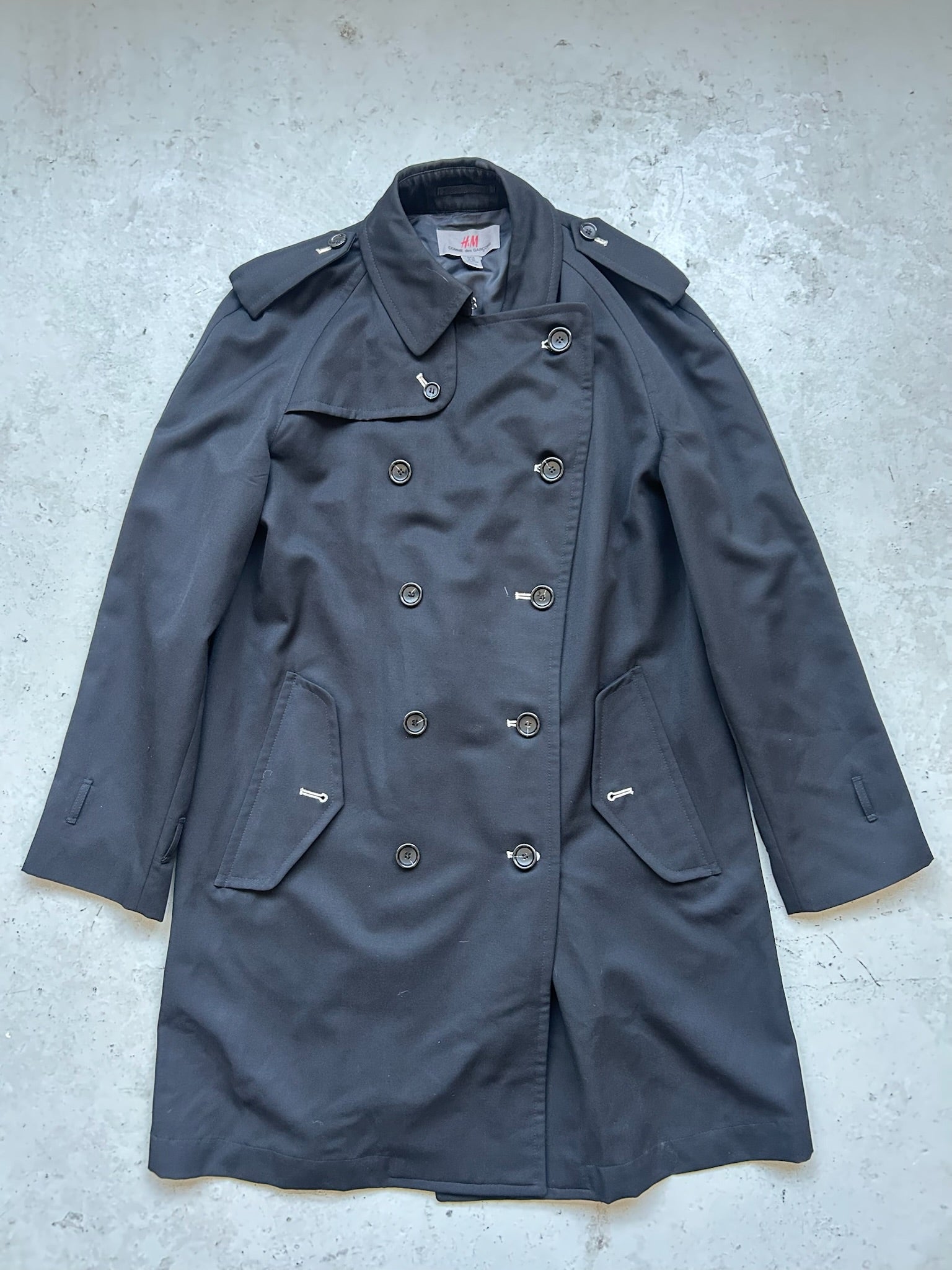 Elevate your wardrobe with this iconic collaboration between Comme Des Garçons and H&M. This trench coat merges avant-garde design with accessible luxury, featuring sharp tailoring and architectural silhouettes that define the Comme Des Garçons aesthetic. Perfect for layering or wearing as a statement piece, it delivers sophisticated style with modern edge. A timeless investment piece that transcends seasons and trends.