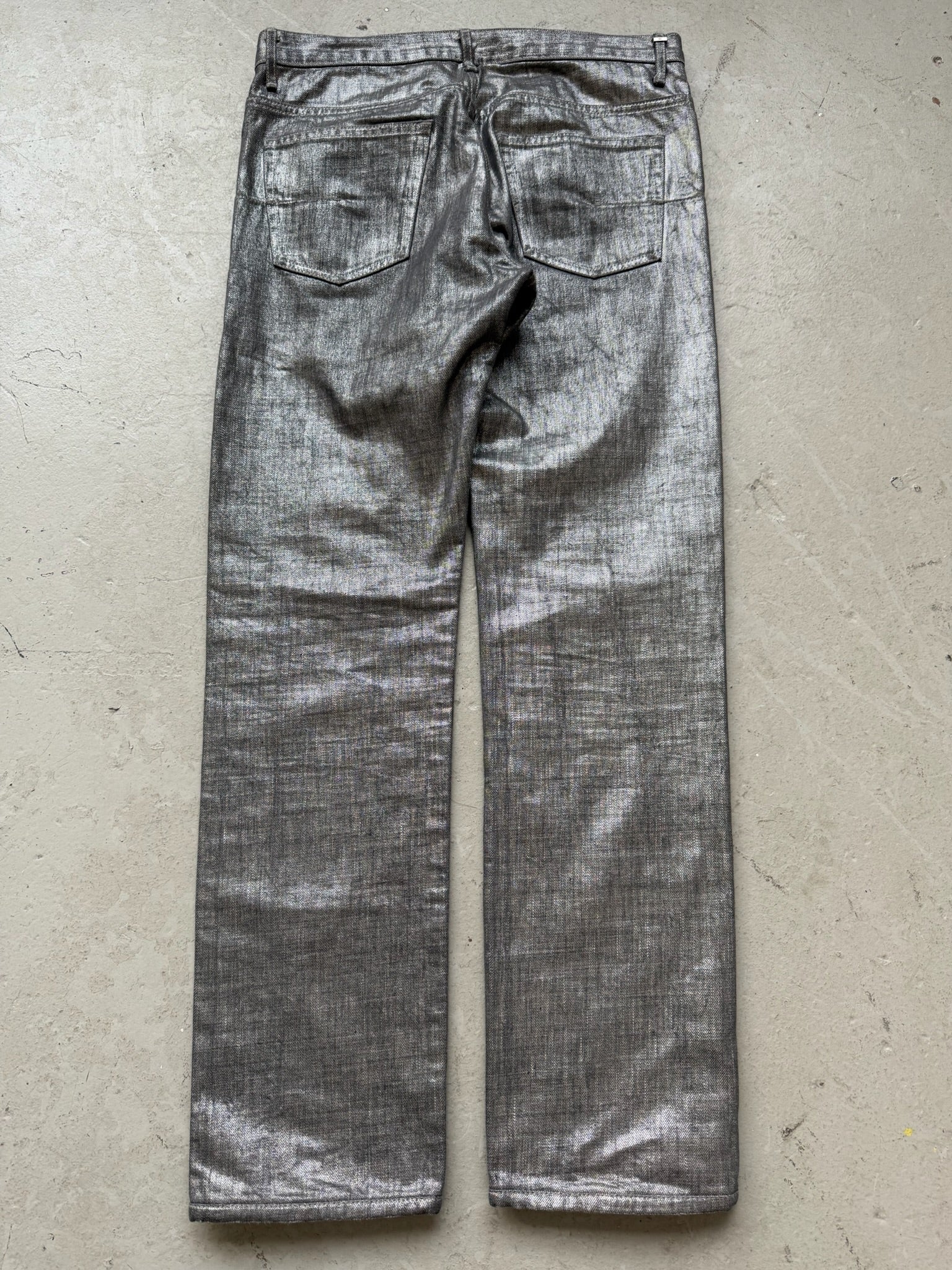 Dior Homme's Autumn/Winter 2006 collection piece featuring the iconic Silver Radioactive Clawmark design. This archive garment exemplifies the house's bold aesthetic from the era, showcasing distinctive graphic detailing that defined the season. A significant piece for collectors of haute couture and vintage Dior, representing the creative vision of John Galliano during a pivotal moment in the brand's contemporary history. Size 30.