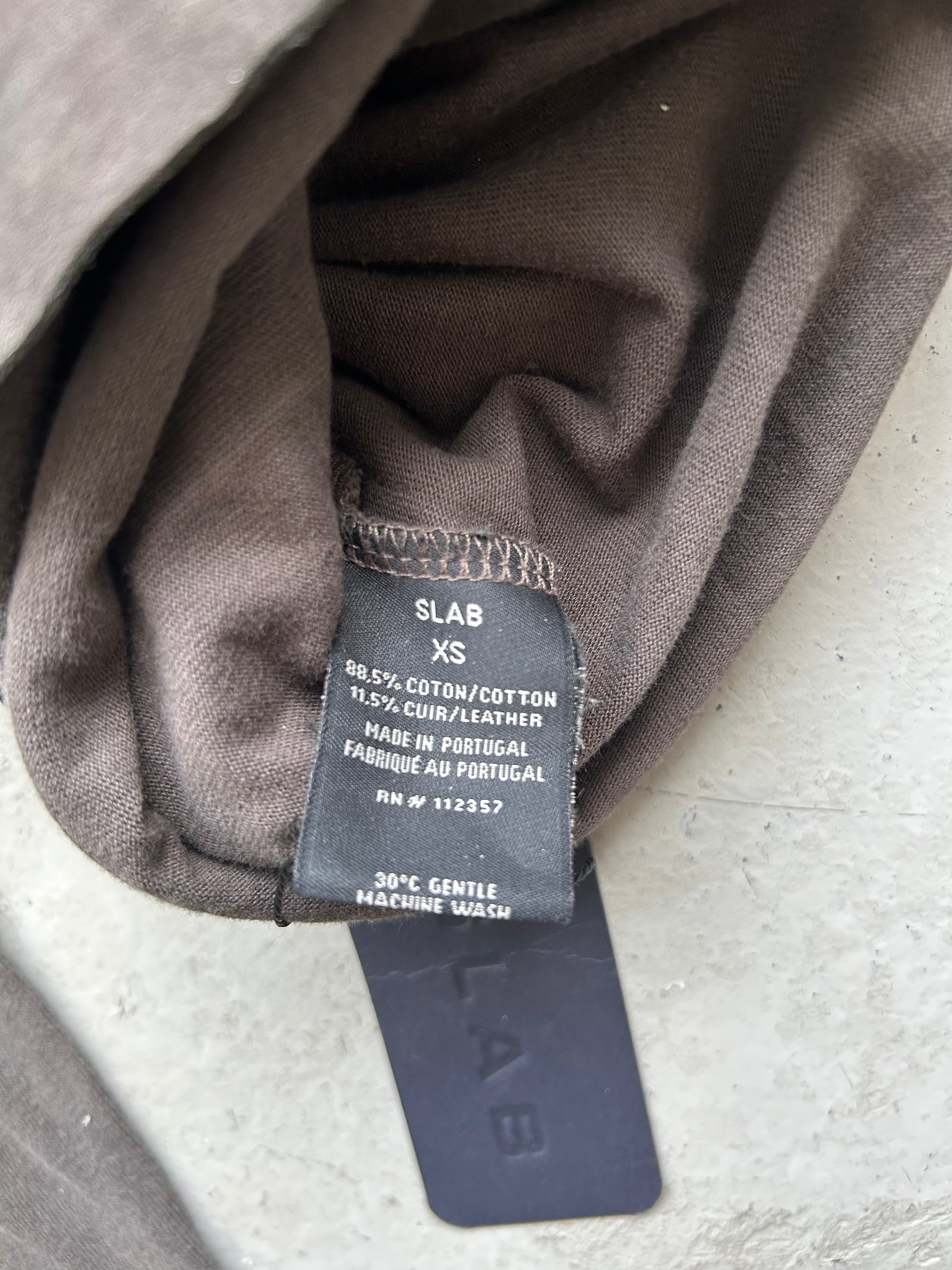 Rick Owens' SLAB collection represents the designer's most architecturally ambitious work, and this triple-layered leather t-shirt exemplifies that vision. Constructed from premium leather in three distinct layers, the piece creates dramatic dimensional silhouettes and unexpected volume through its deconstructed construction. The result is a sculptural garment that challenges conventional tailoring while maintaining wearability. New with tags, this XS piece showcases Rick Owens' signature approach to proportion and material innovation—a statement piece for collectors who understand avant-garde design.