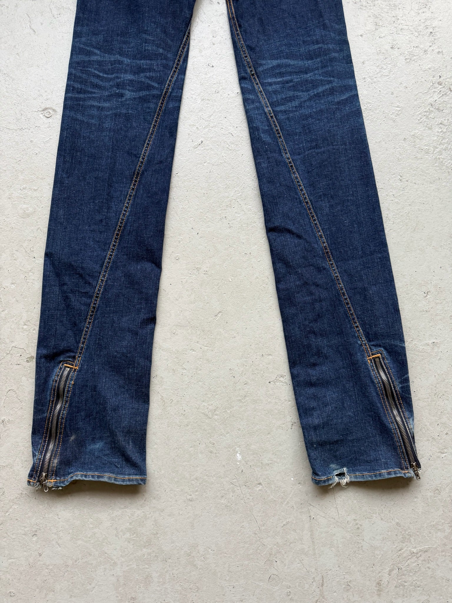 Rip Van Winkle Blue Wash Zipper Flare Denim Crafted with a distinctive blue wash that captures vintage authenticity, these flare denim jeans feature a striking zipper detail that elevates the classic silhouette. The flared leg creates a flattering, elongated line while the expertly faded finish delivers that coveted worn-in aesthetic. Perfect for those seeking statement-making denim with timeless appeal and contemporary edge.