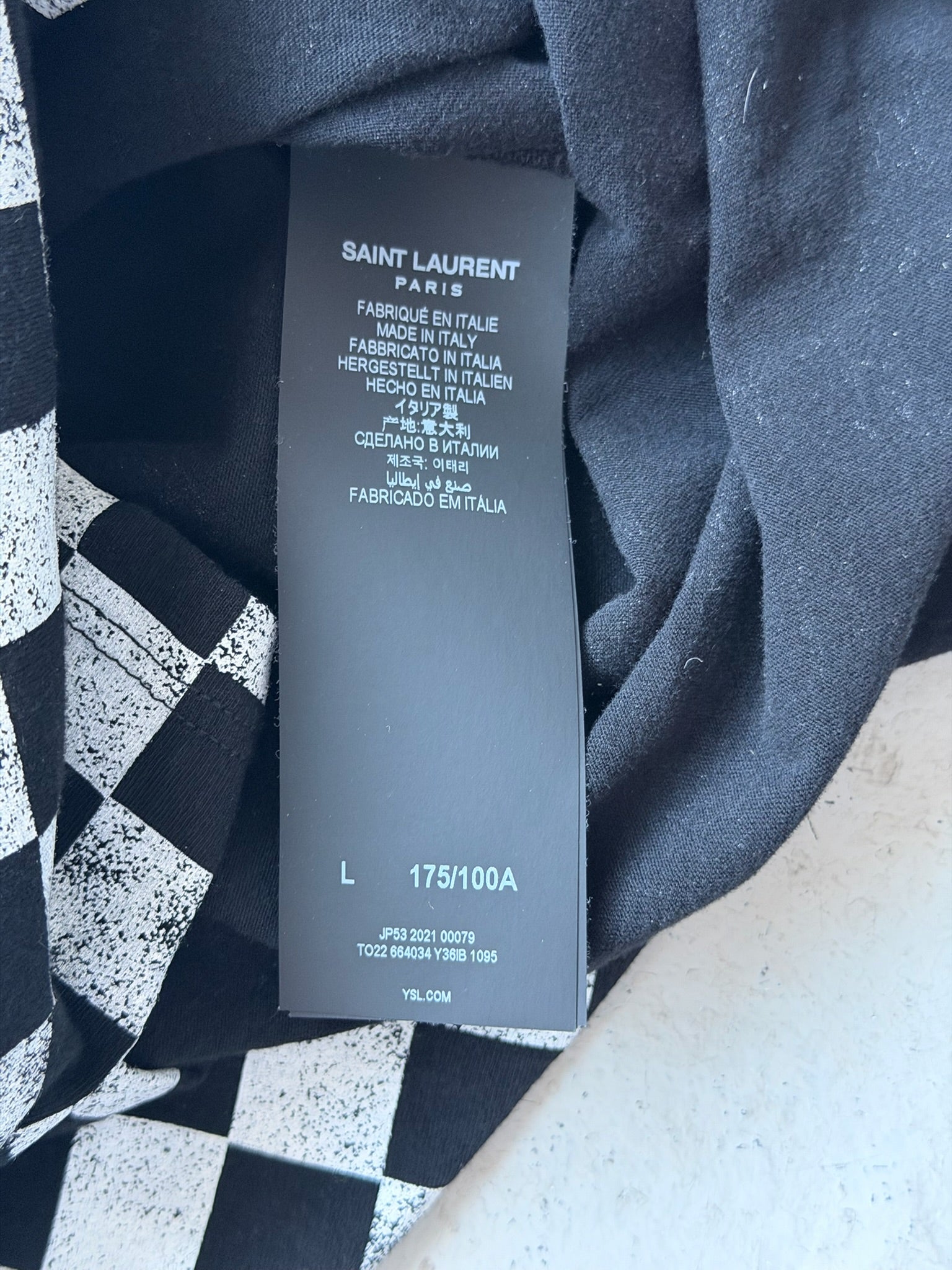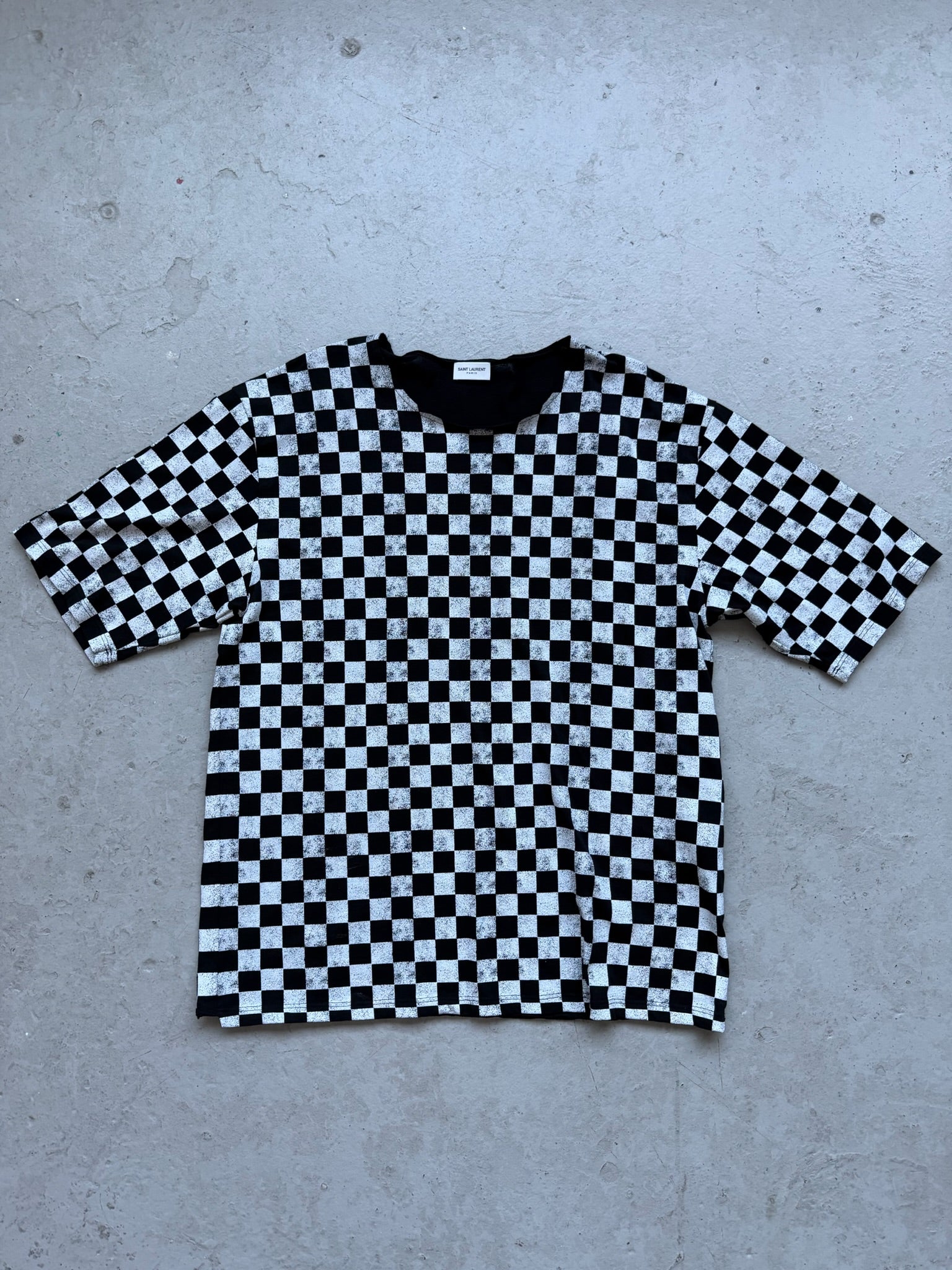 Saint Laurent Paris 2021 Checkerboard Short Sleeve This season's essential from the iconic French luxury house features a striking checkerboard pattern rendered in contrasting tones across a refined short-sleeve silhouette. Crafted with the meticulous attention to detail Saint Laurent is renowned for, this piece exemplifies understated sophistication and contemporary minimalism. The structured fit and premium construction make it a versatile foundation for elevated everyday styling or layered with tailored pieces for a polished aesthetic. A timeless addition to any discerning wardrobe.